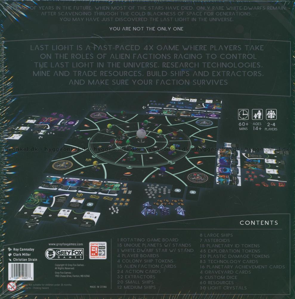 Last Light är ett snabbt och spännande 4X-spel där 2–4 spelare ger sig ut på en galaktisk resa för att dominera den sista ljuskällan i universum. Spelet utspelar sig miljarder år in i framtiden, där nästan alla stjärnor har dött och endast sällsynta vita dvärgstjärnor ger ljus. Spelarna tar roller som olika utomjordiska fraktioner som tävlar om att skörda ljus och uppnå teknologiska genombrott för att få ett övertag över sina motståndare.