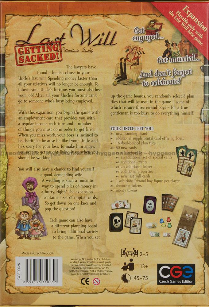 With this expansion added to Last Will, each player begins the game with a job card that provides him with a regular income each turn and details a number of things the player must do in order to get fired. Unlike in real life, it can be difficult to persuade your employer to give you the old heave-ho. When you miss work, he's inclined to be charitable because he liked your uncle and he's sorry for your loss. To make him angry, you need to get caught living it up when you should be working. He won't sack you straight away, but he will at least dock your salary.