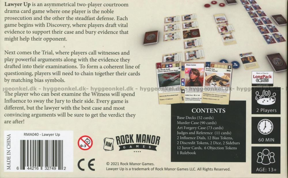 Lawyer Up är ett asymmetriskt kortspel för två advokater som möts i rätten. Den ena spelaren får rollen som åklagare medan den andra spelar som försvarare.