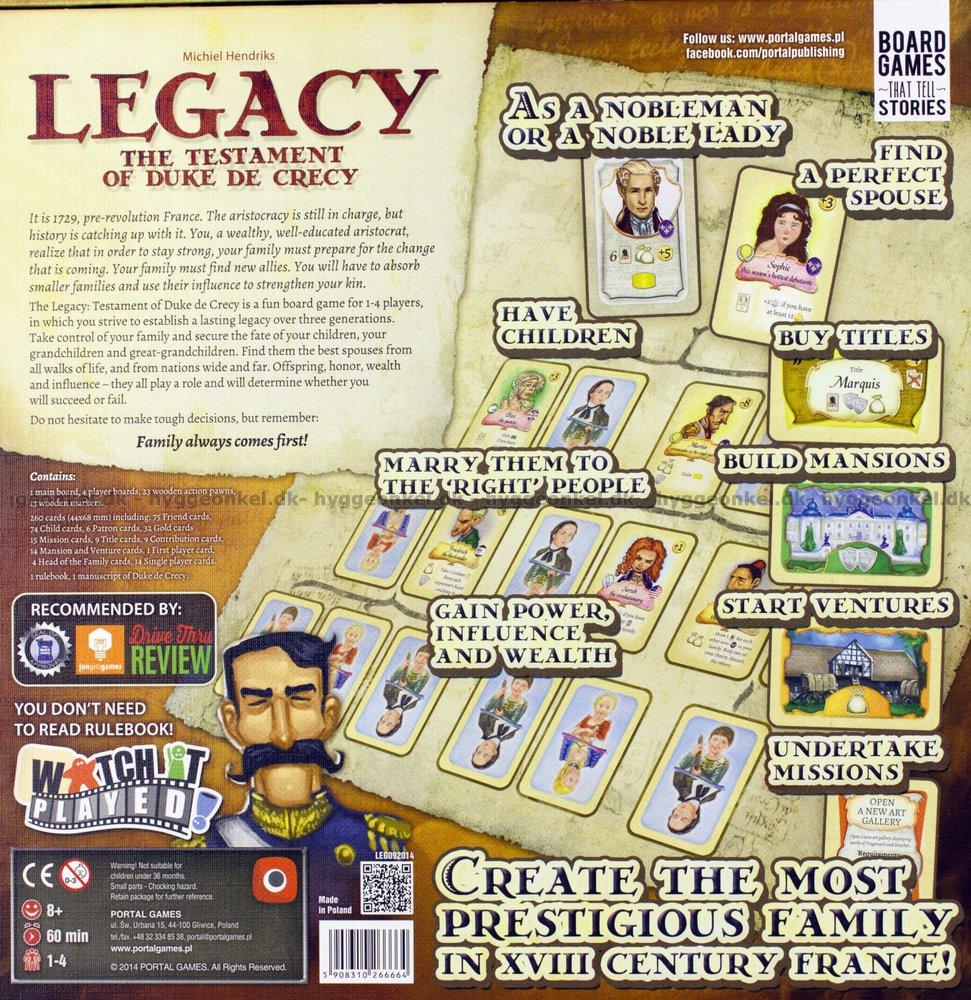 Legacy är ett brädspel som handlar om att bygga upp en familj av aristokrater. När det är din tur ska du utföra handlingar som hjälper till att öka familjens inflytande, makt och/eller rikedom.