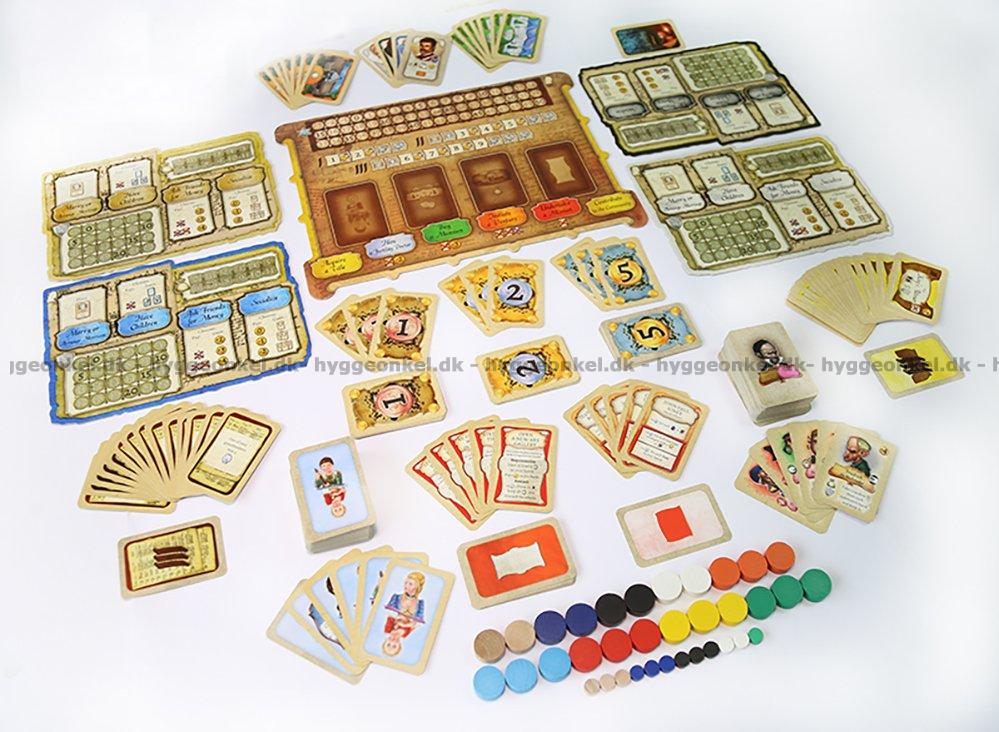 1 spelbräde, 4 individuella spelbräden, kort och pjäser i trä.
