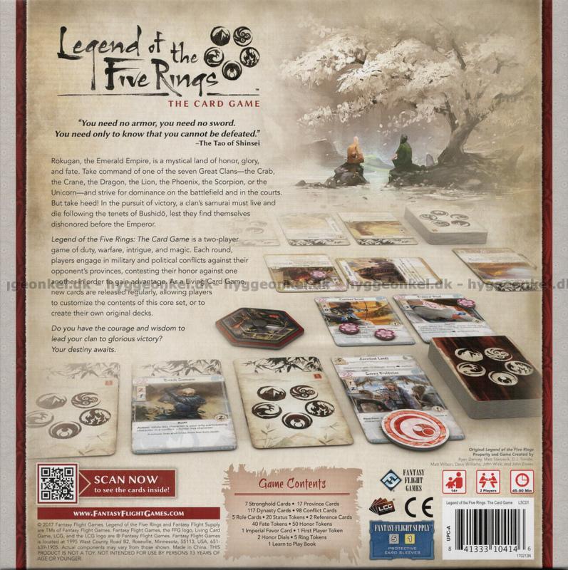 Legend of the Five Rings: The Card Game-grundsetet har allt som spelarna behöver för att utforska Rokugans sju mäktiga klaner: Crab Clan, Crane Clan, Dragon Clan, Lion Clan, Phoenix Clan, Scorpion Clan och Unicorn Clan. I setet finns också de nödvändiga komponenter som gör det till startpunkten för Legend of the Five Rings: The Card Game.
