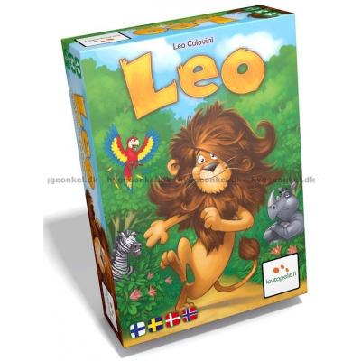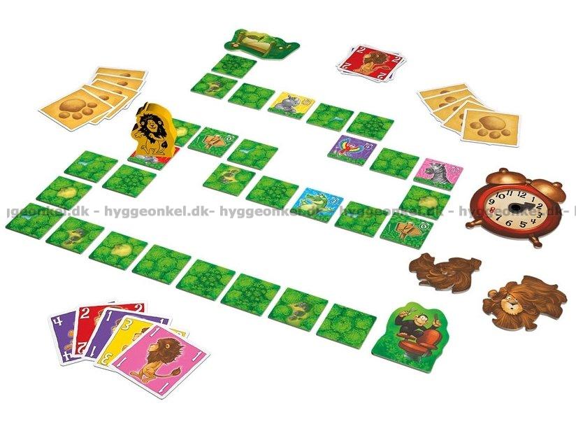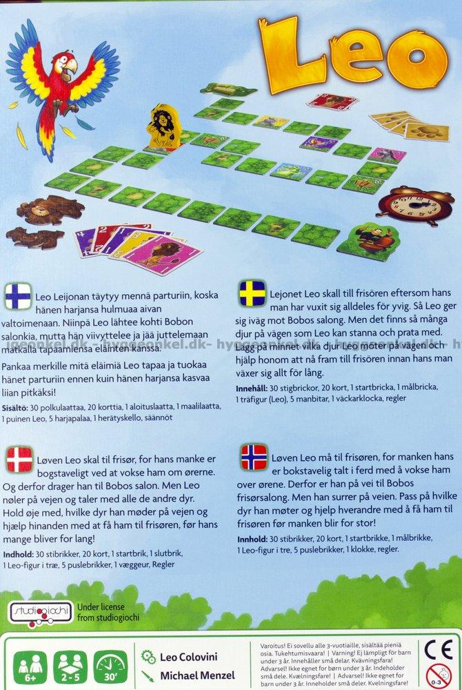 20 kort, 30 bitar som bygger upp stigen till frisören samt lejonet Leo i trä.
