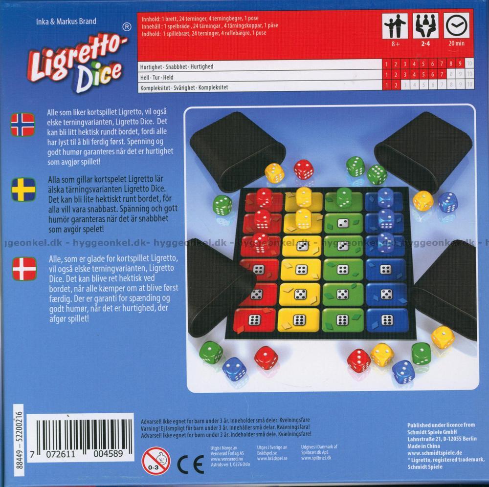 Principen här i Ligretto Dice (dice = tärning) är precis densamma – alla spelare försöker bli av med sina tärningar så snabbt som möjligt.