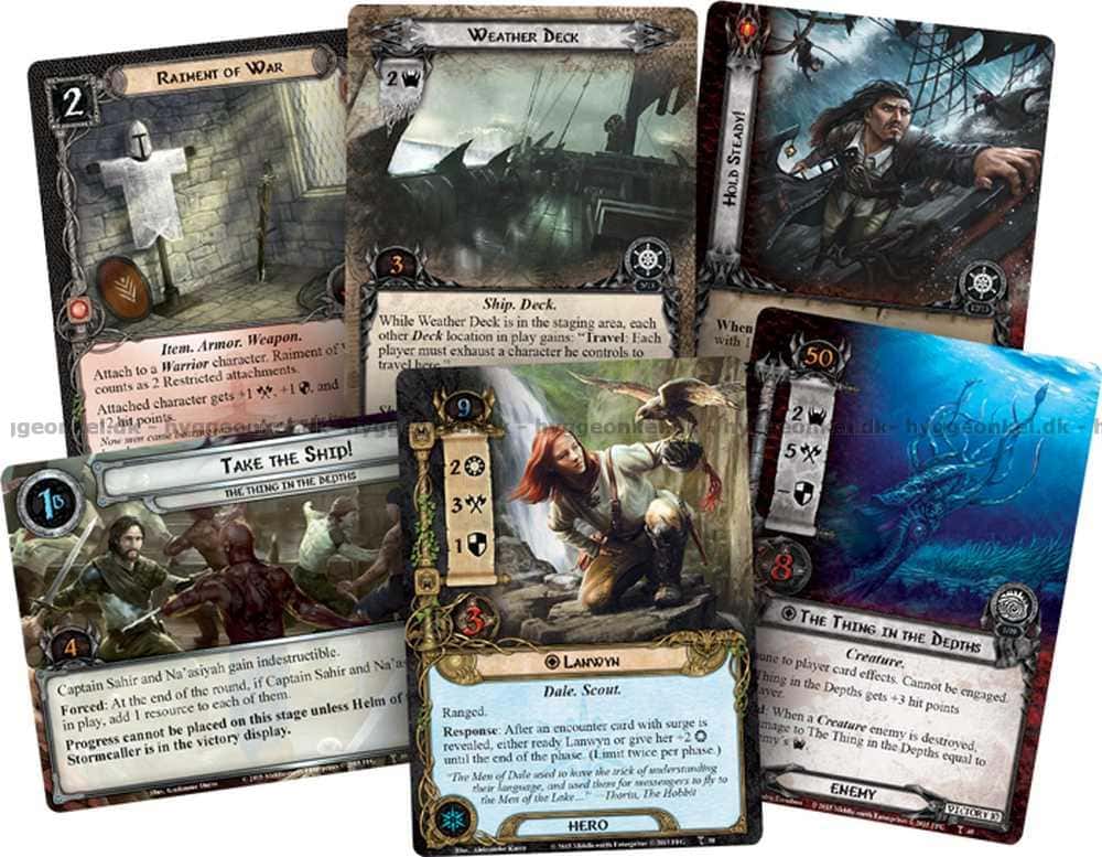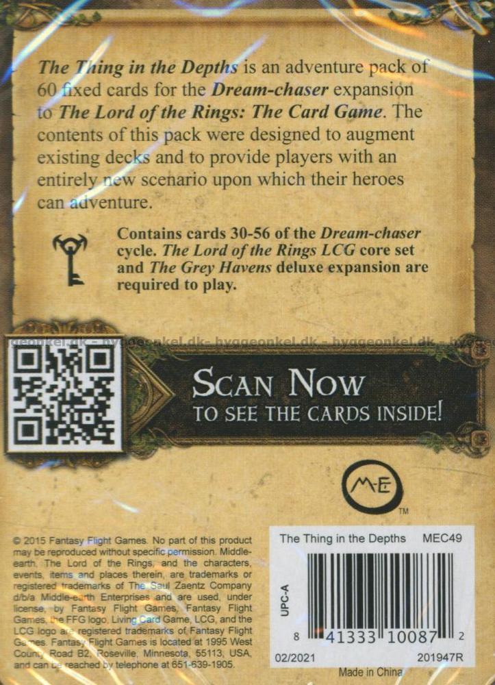 The Thing in the Depths är en expansion till populära Lord of the Rings LCG. Notera att du måste ha både grundspelet och expansionen The Grey Havens för att kunna använda den.