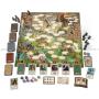 Spelbräde, kort, pappbrickor, tärningar och pappmarkörer.