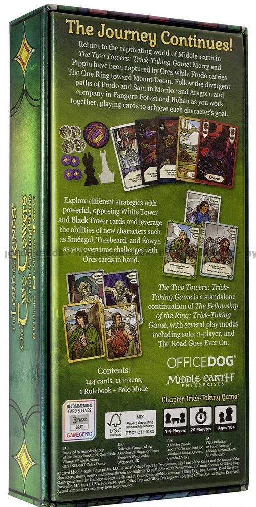 Resan genom Midgård fortsätter i Lord of the Rings: The Two Towers – Trick-Taking Game, ett stämningsfullt och berättelsedrivet kortspel där spelarna tar rollerna som hjältar och skurkar från Tolkiens klassiska berättelse. Spelet är en fristående fortsättning på The Fellowship of the Ring: Trick-Taking Game och täcker kapitel 19–36 från den episka historien. Varje kapitel bjuder på nya utmaningar där spelarna måste uppfylla specifika villkor för sina karaktärer för att komma vidare i berättelsen.