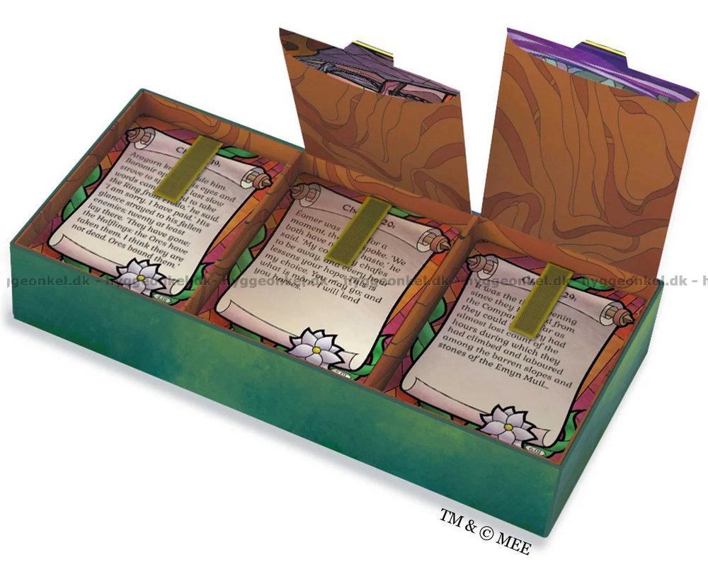 Längs vägen introduceras nya figurer, föremål och prövningar som ständigt förändrar spelets dynamik. Den Enda Ringen fungerar som spelets enda trumfkort, men kan endast spelas när ett kort utanför färg har lagts. Med The Two Towers – Trick-Taking Game kan du fördjupa dig ännu mer i Tolkiens universum och uppleva kampen om Midgård på ett nytt och intensivt sätt.