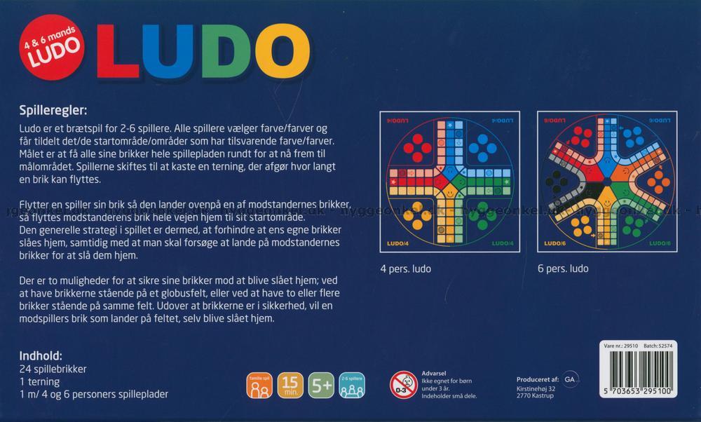 Asken innehåller ett spelbräde (den ena sidan är för 4 spelare medan den andra har plats för 6 spelare), 1 tärning, pjäser och spelregler. Reglerna är på danska men du känner säkert till dem sedan tidigare.