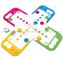 Spelplanen mäter cirka 20 x 20 cm. Dessutom ingår 16 platta pappbrickor och en vanlig tärning.