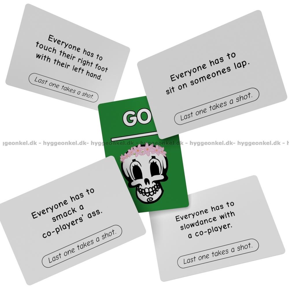 Go: Den som kastat tärningen ska utföra den handling som beskrivs på kortet. De andra spelarna ska sedan göra detsamma. Den som är långsammast ska ta en shot.