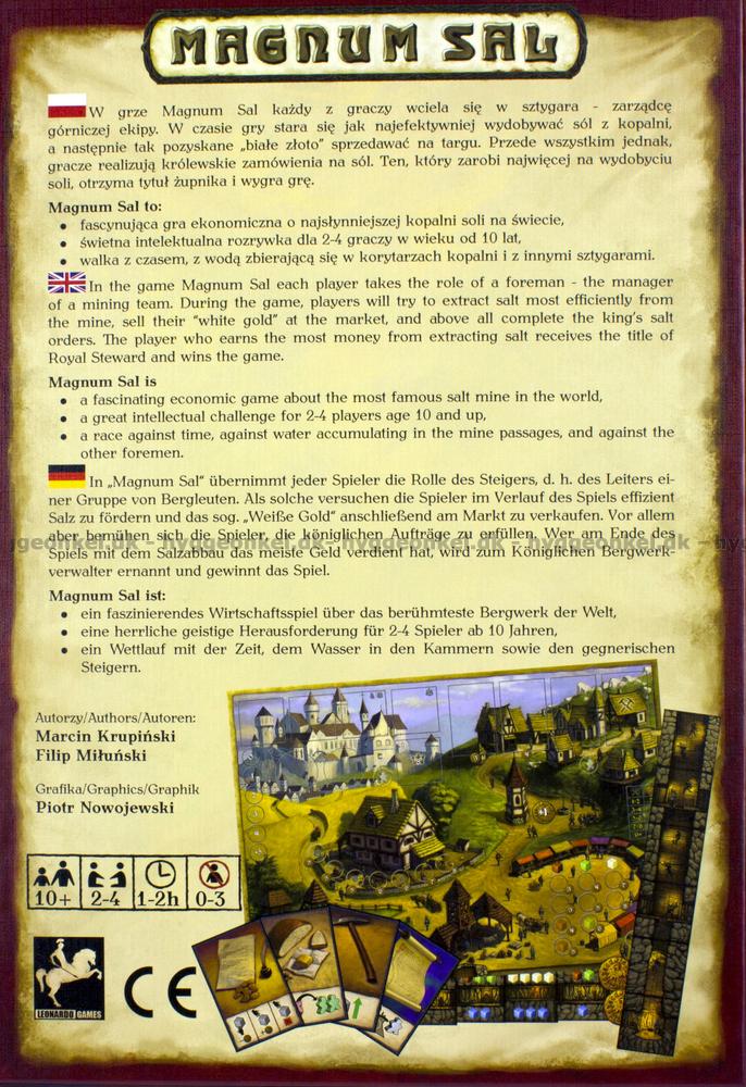 Magnum Sal is a eurogame about exploration of a salt mine (second oldest still operating salt mine in the world). Each player takes the role of a foreman - the manager of a mining team. During the game, players will try to extract salt most efficiently from the mine, sell their "white gold" at the market, and above all complete the king's salt orders. The player who earns the most money from extracting salt receives the title of Royal Steward and wins the game.