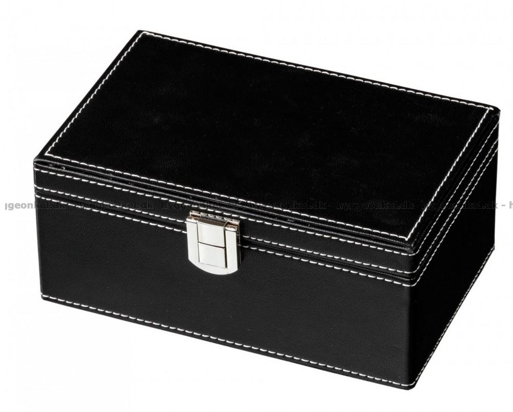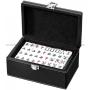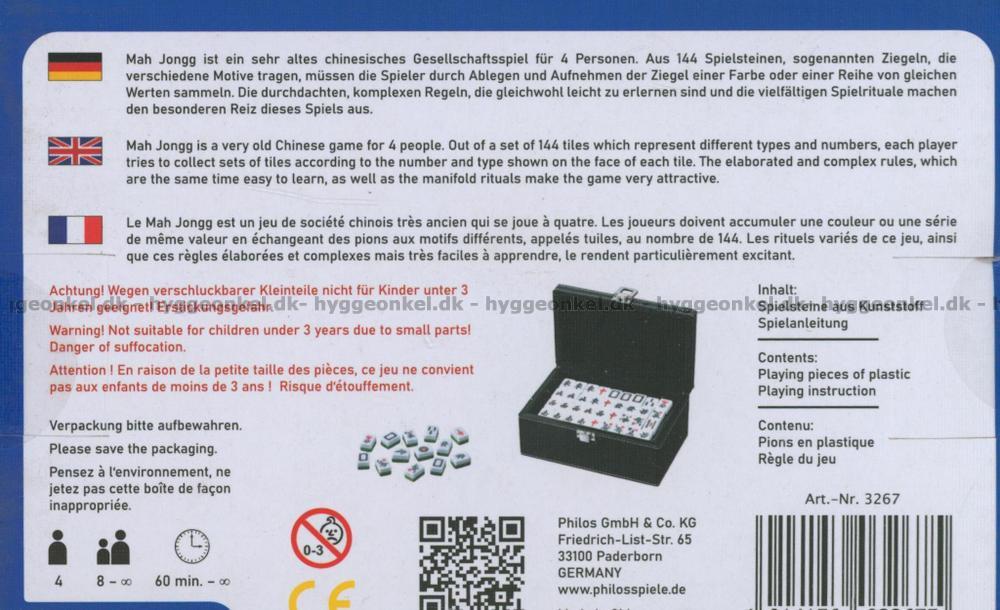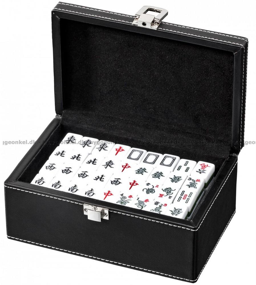 Denna utgåva av det klassiska brädspelet Mahjong levereras i en box i läderimitation. Asken har en botten i filt så att den inte repar bordet.
