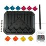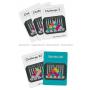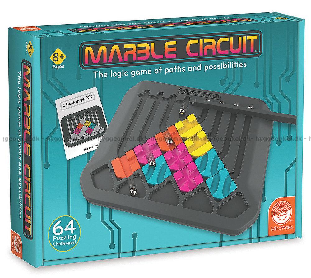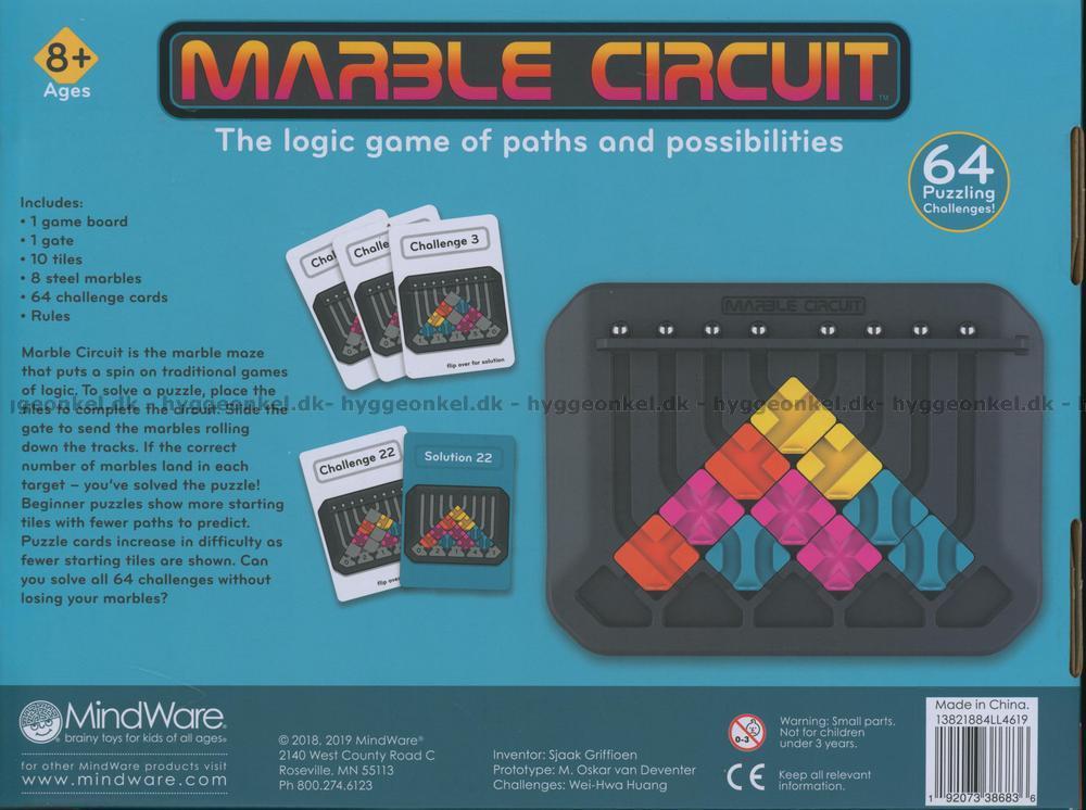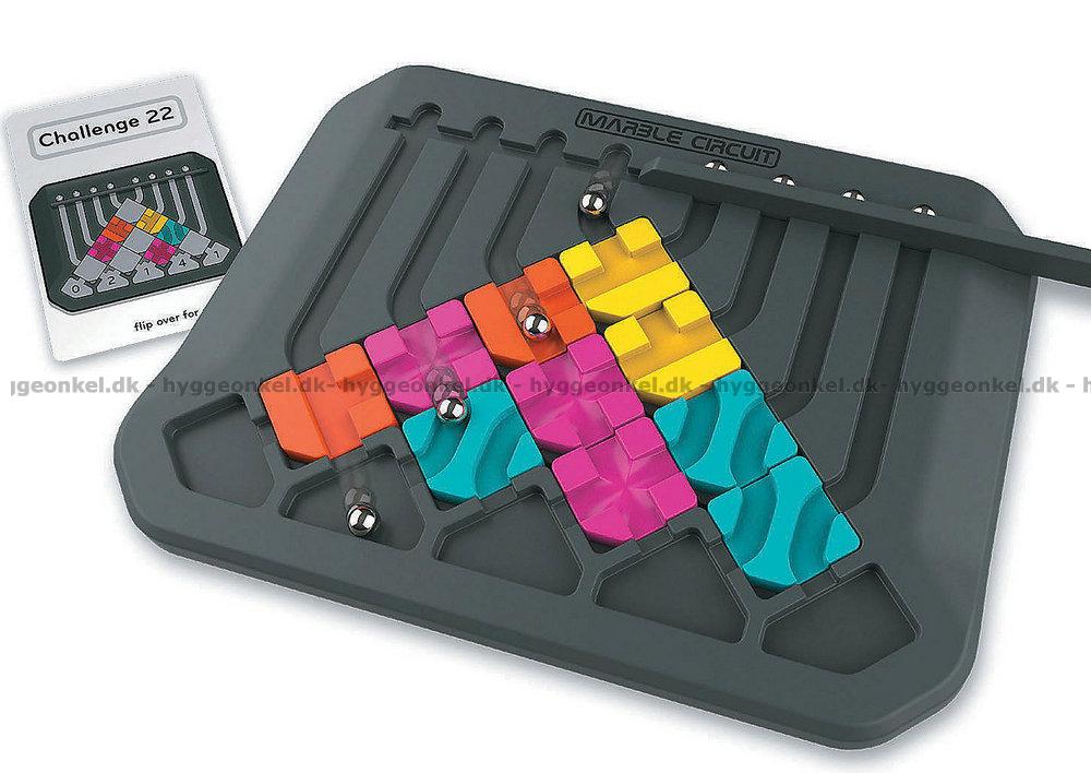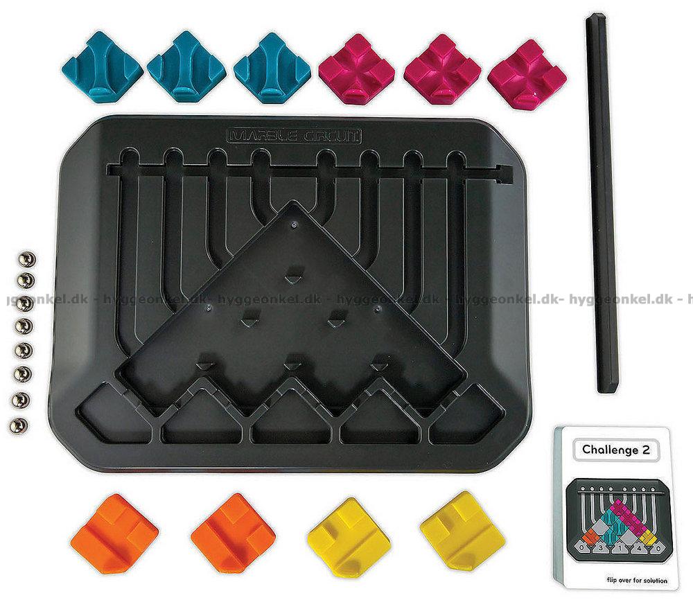 Spelområde (mäter cirka 27 x 20 cm), 10 brickor, kulor och 64 kort med utmaningar.