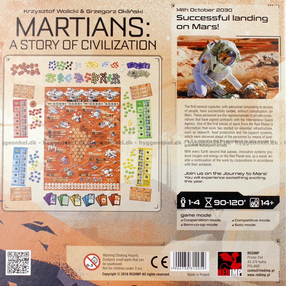Den första expeditionen till Mars slutade med en heroisk kamp för överlevnad medan astronauterna försökte att inleda koloniseringen av den röda planeten finansierade av fyra stora företag på Jorden. I Martians: A Story of Civilization ska kolonin på Mars, styrd av ledarna från de fyra stora företagen, utforska planeten för att hitta nödvändiga resurser, bygga upp nya byggnader och utveckla teknologierna. Syftet är inte bara att säkra kolonisatörernas överlevnad utan också att de kan leva och utvecklas i många framtida generationer.