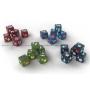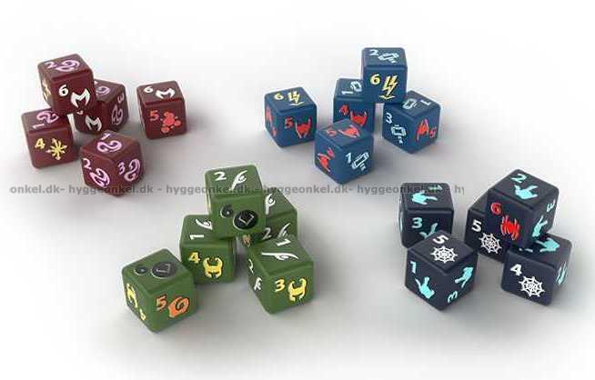 Tärningar, kort och marker.