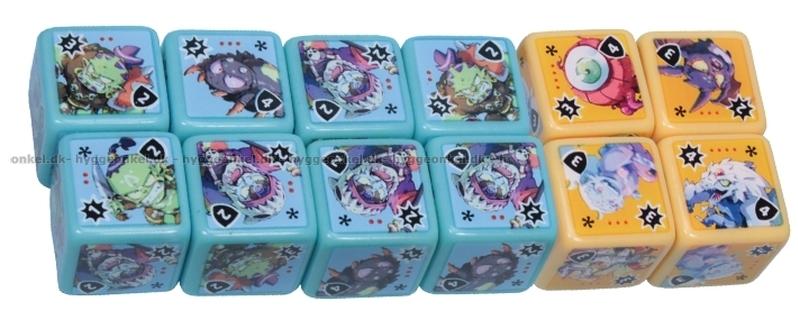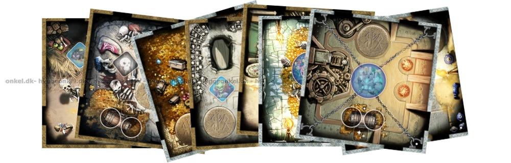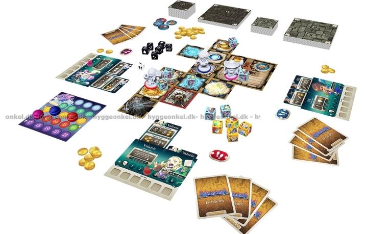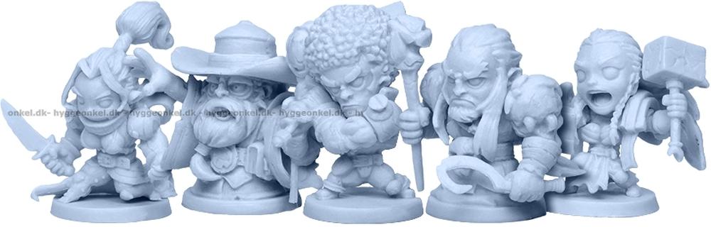5 miniatyrfigurer i plast, tärningar, brickor, kort och marker.