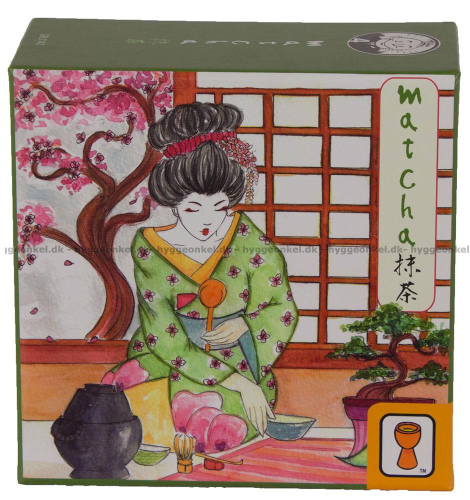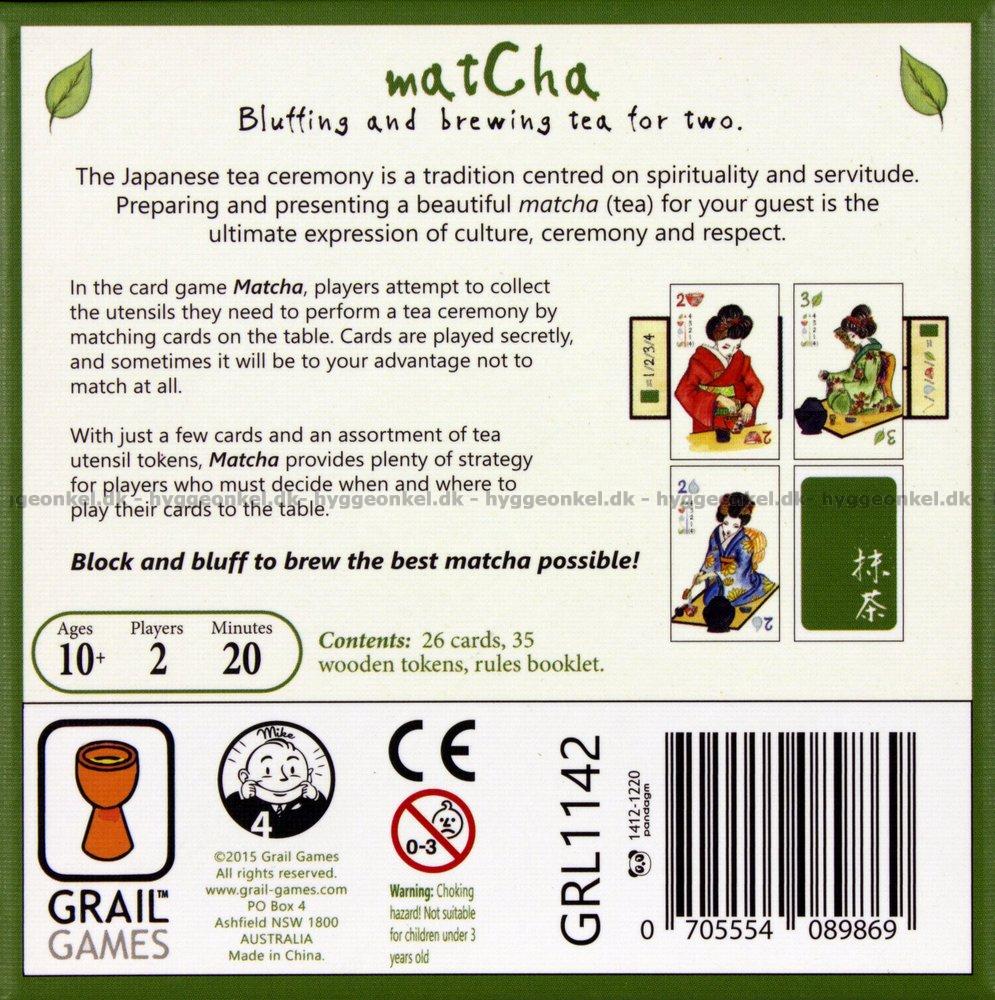 In Matcha, players attempt to collect the utensils (chadogu) they need to perform a tea ceremony by matching tea ceremony (otemae) cards on the table by either their number (1-4) or suit (tea, water, bowl & scoop.) Cards are played secretly, and sometimes it will be to your advantage not to match at all.