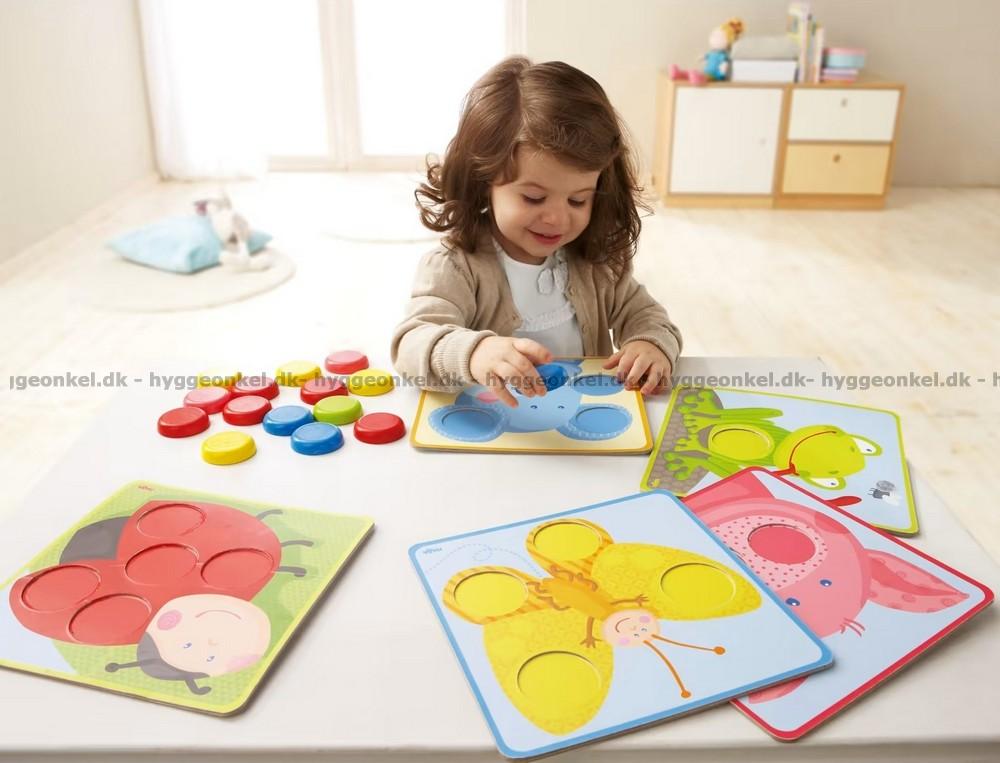 Barnen ska nu hitta exempelvis de gula träbrickorna och placera dem i hålen på fjärilens vingar eller ta de röda brickorna och placera dem på nyckelpigans vingar.