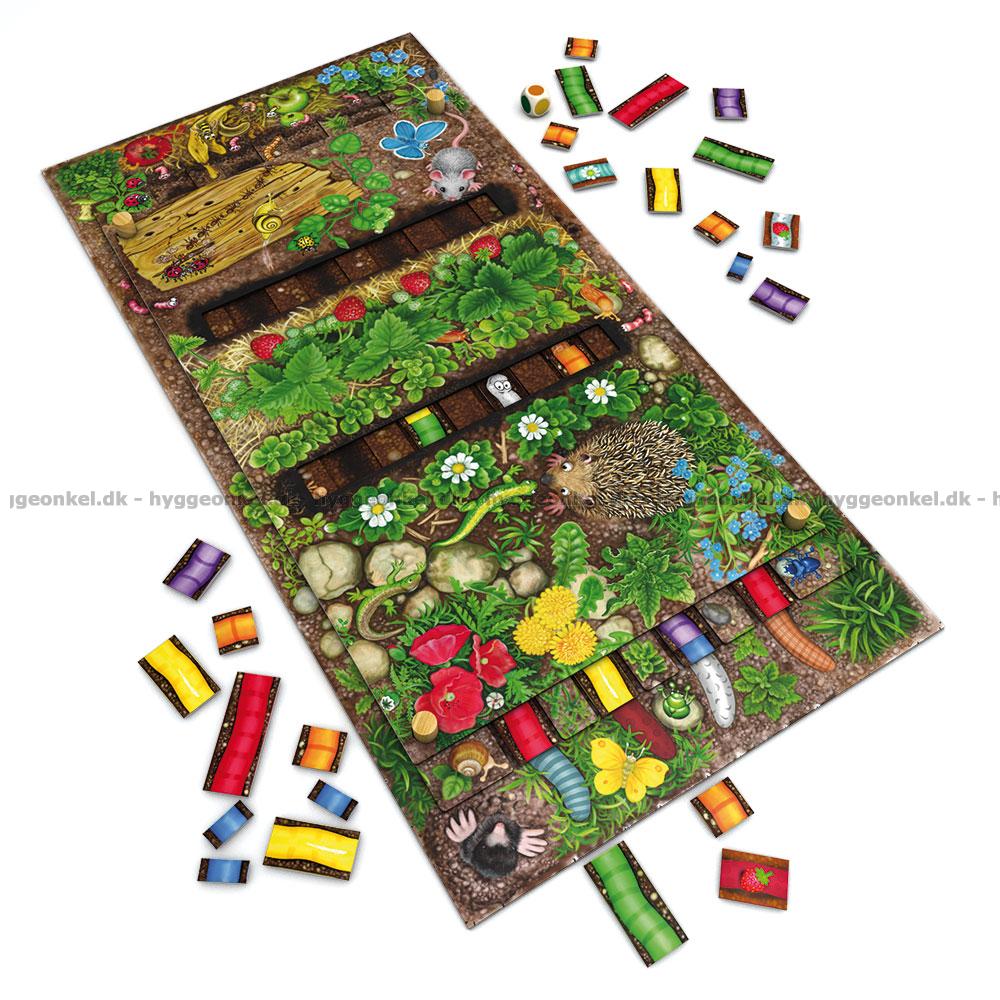 I kartongen hittar du 60 maskdelar, 1 tärning med olika färger, 4 maskhuvuden, 4 jordgubbar och 4 prästkragar.