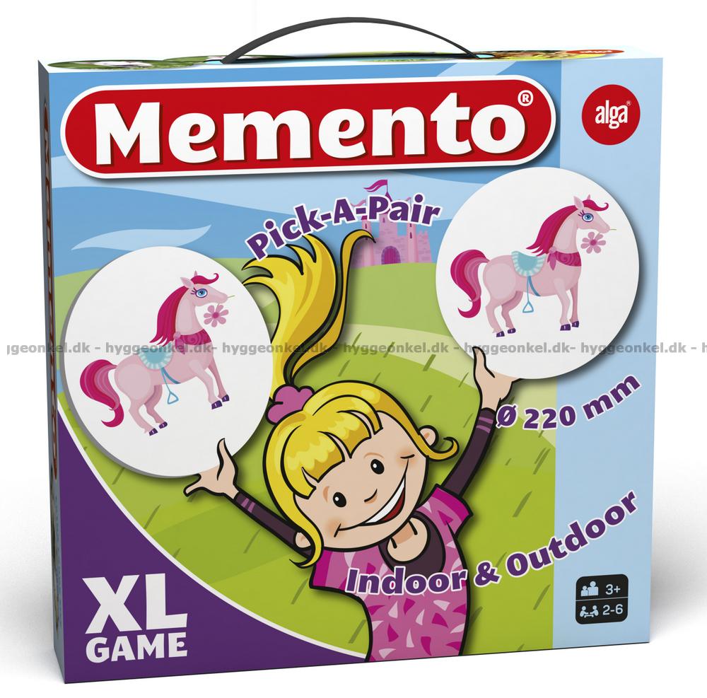 Barn med spring i benen älskar Memento XL. Lägg ut 32 stycken blanka, megastora bildkort. Vänd upp två kort och se om bilderna matchar. Vem hittar flest par?