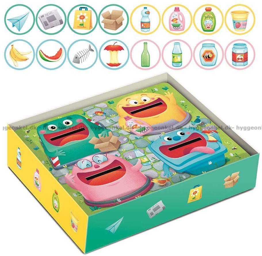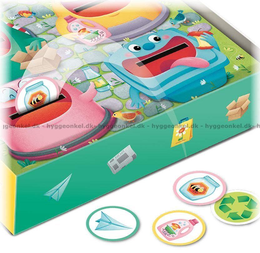 I asken för spelet hittar du 32 brickor i kartong som passar ihop 2 och 2. De runda brickorna har en diameter på 5,5 cm. Därutöver medföljer 4 avfallstunnor (brickor i kartong).