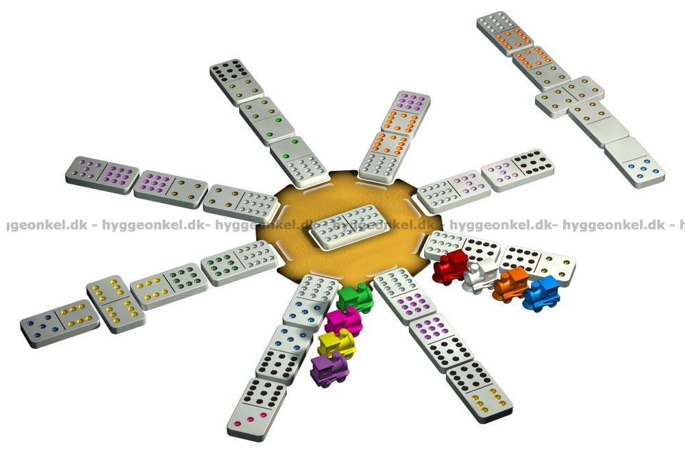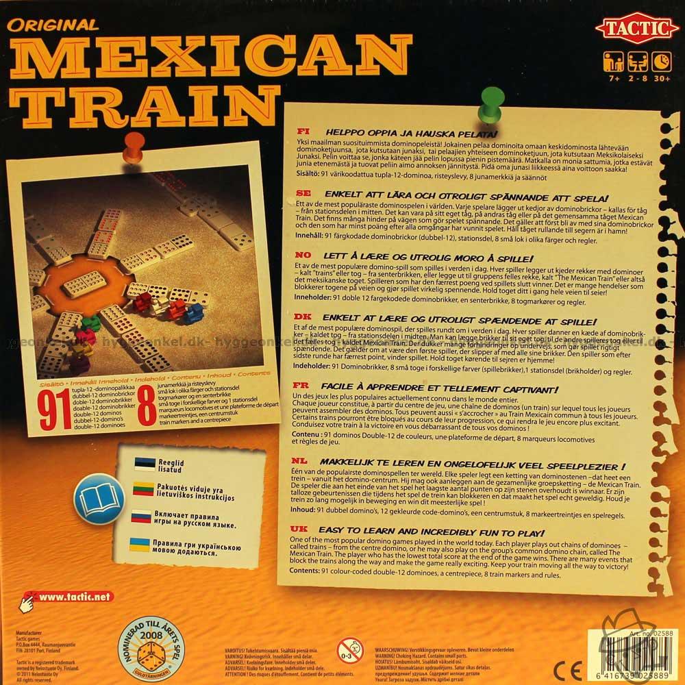 I boxen hittar du 91 dominobrickor, 8 små tåg, en brickhållare och spelregler.