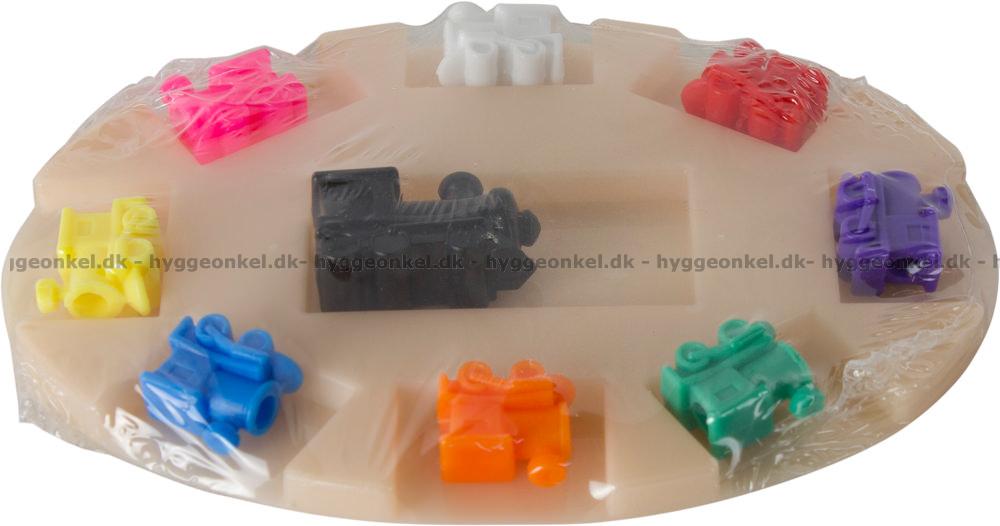 Här får du 8 färgade tåg (mäter cirka 1,8 x 1,8 x 1 cm) och 1 lite större svart tåg (mäter cirka 3,5 x 1,9 x 1,5 cm).