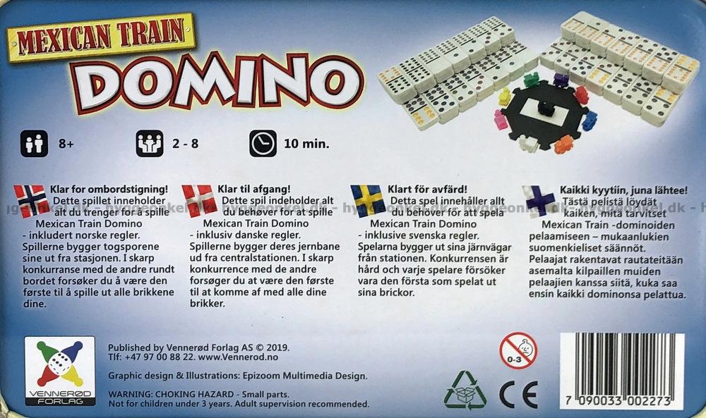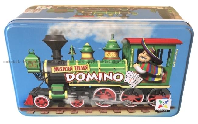 Det klassiska och populära dominospelet Mexican Train i en ask av metall.