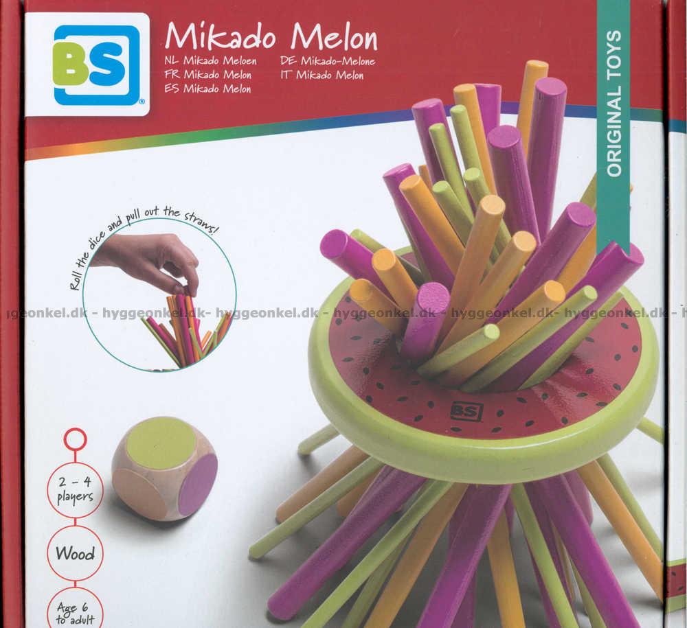 Placera pinnarna i melonskivan. Kasta med tärningen och se om du kan dra ut en pinne med den färg som tärningen visar.