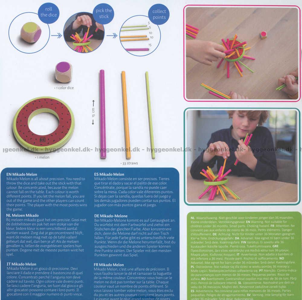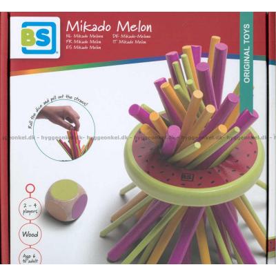 33 pinnar (15 cm långa), 1 melonskiva (9 cm i diameter) och 1 tärning. Alla delar är i trä.