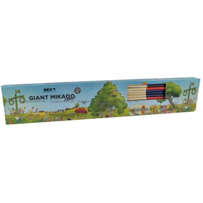 I den fina röda träasken hittar du 41 träpinnar märkta med olika färger som representerar olika poängtal. Pinnarna är 28 cm långa.