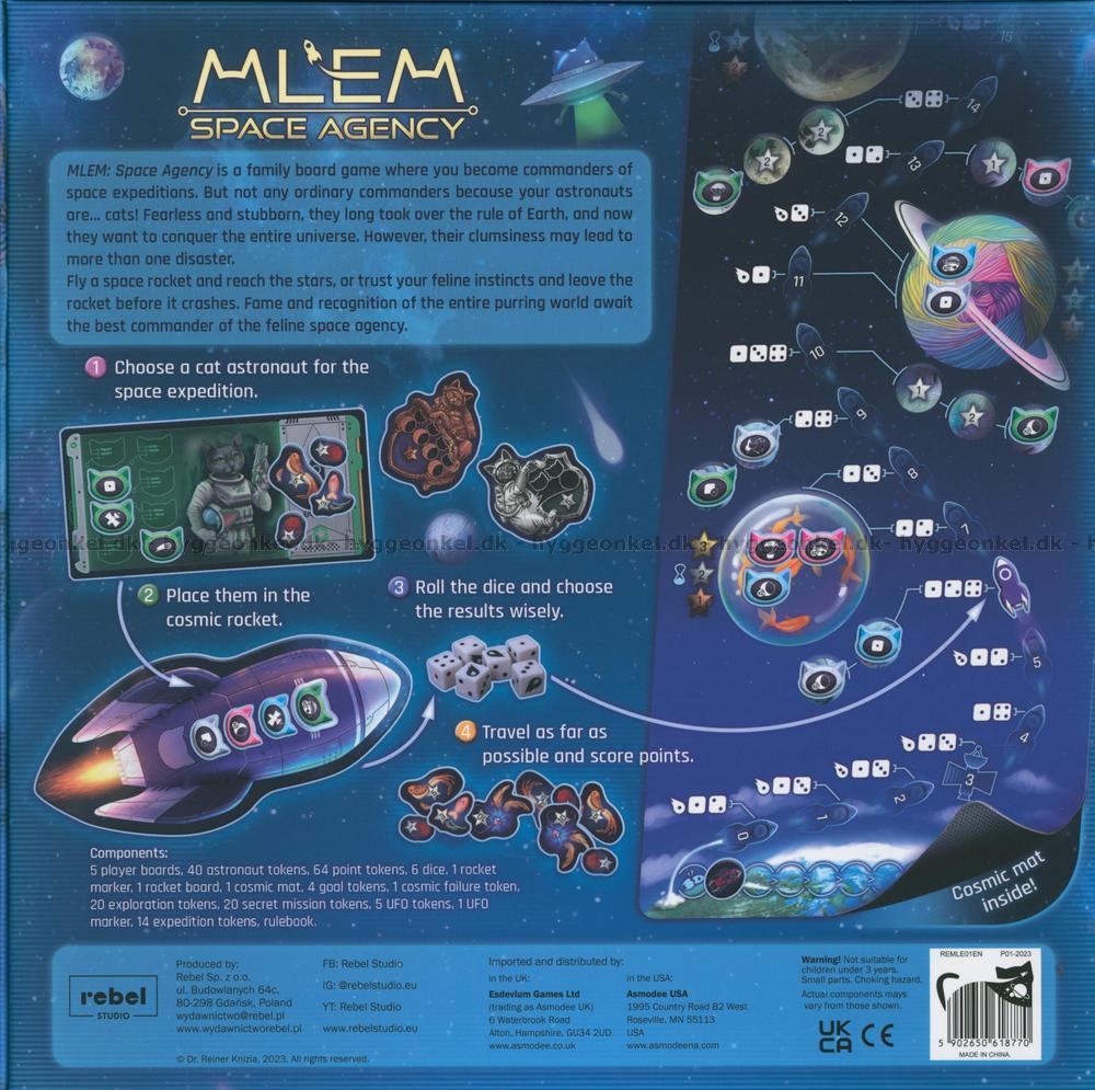 Dyk in i en förtrollande framtid år 2075 då katterna inte bara har erövrat jorden utan nu också sätter sina klor i den oändliga rymden. MLEM: Space Agency är ett familjebrädspel där man spelar som modiga kaptener för kosmiska expeditioner, detta med en twist – dessa orädda utforskare är katter.