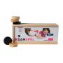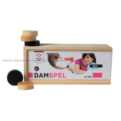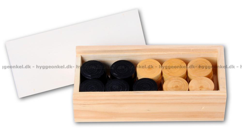 Här får du en träbox med träpjäser att använda i kvarnspel och dam.