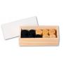 Pjäserna ligger i en träbox som mäter 17,5 x 8 x 5 cm.