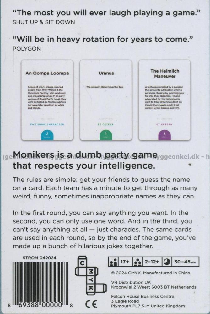 Monikers är ett hysteriskt roligt sällskapsspel där det gäller att få ditt lag att gissa så många tokiga och ibland lite opassande namn som möjligt på bara en minut.