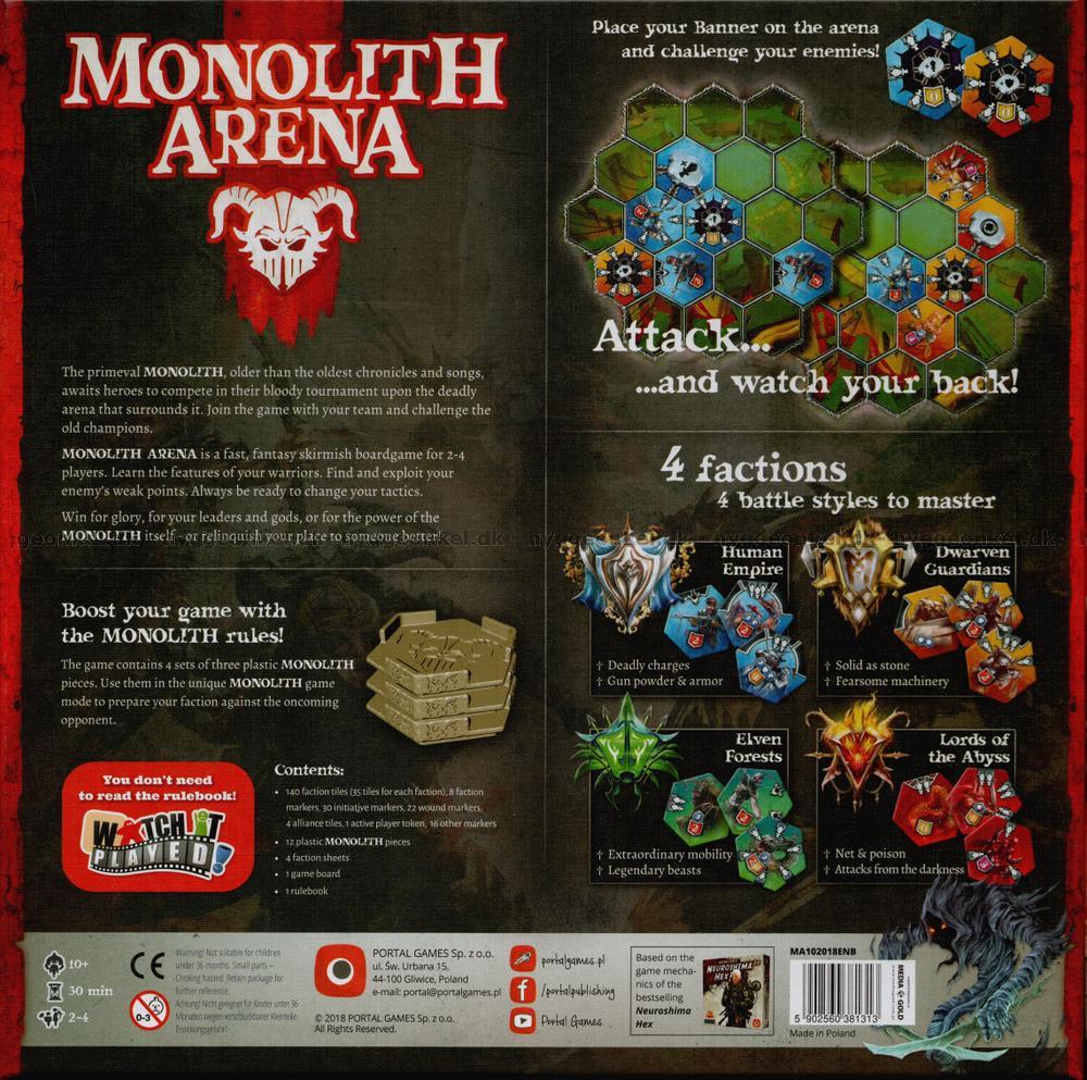Monolith Arena är ett fantasykrigsspel baserat på samma regler som används i Neuroshima Hex - för övrigt ett annat spel som har designats av Michał Oracz. Spelet innehåller fyra olika fraktioner som har olika egenskaper och enheter!