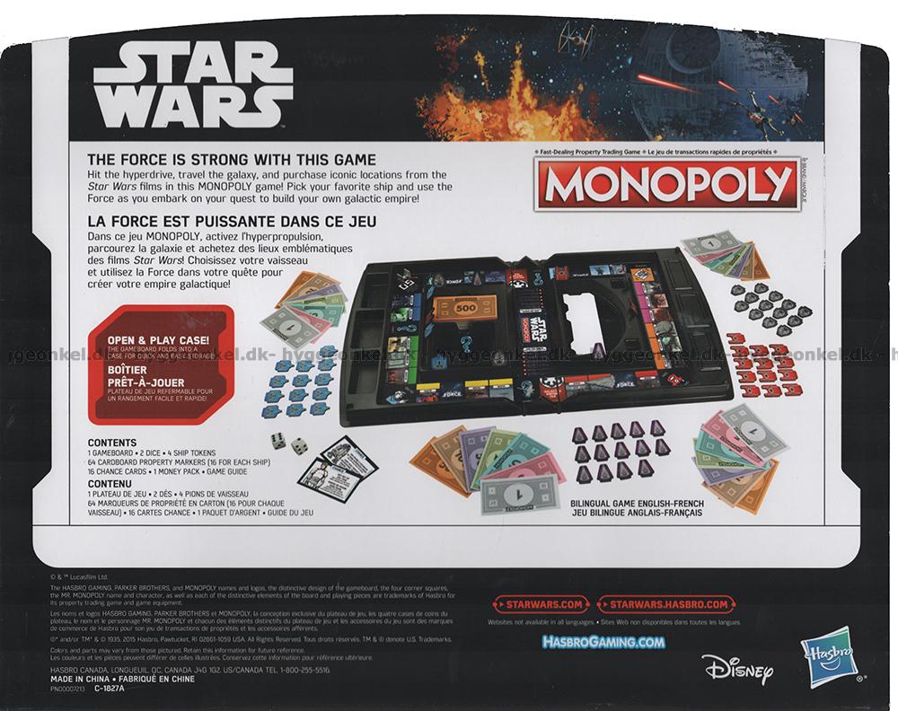 Asken för spelet innehåller spelbräde (insidan på asken), tärningar, pjäser, kort och sedlar.