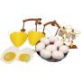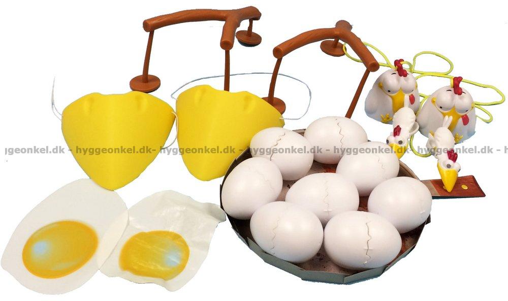 9 st set med äggskal - 9 st äggule ark - 2 set med grenar- 2 st hönsnäbbar - 2 st magnetiske höns clips - 1 st stekpanna av kartong.