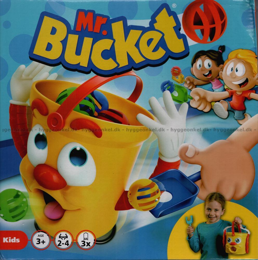 Den roliga hinken "Mr. Bucket" snurrar omkring på golvet. Han vinkar till alla som är omkring honom och spottar ut kulor från sin mun.