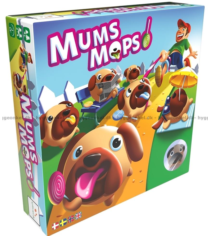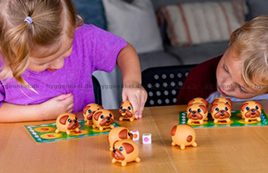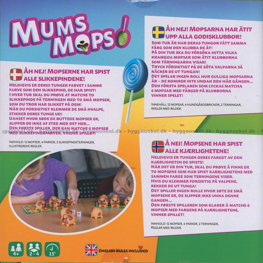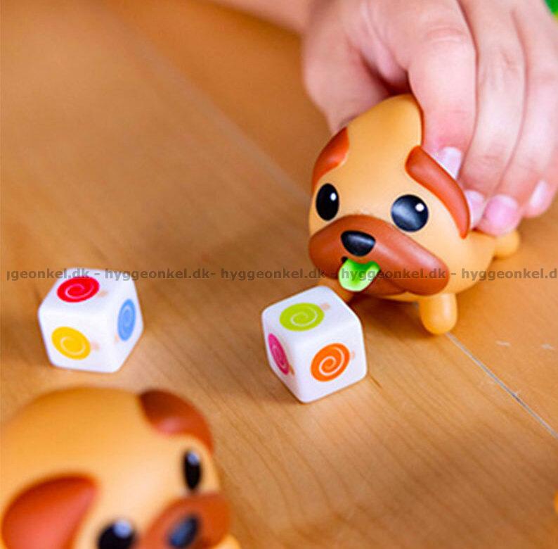 Deras tungor har fått färg efter vilken godsak de har ätit. Slå tärningen och se om du kan hitta en mops med samma färg som tärningen visar.