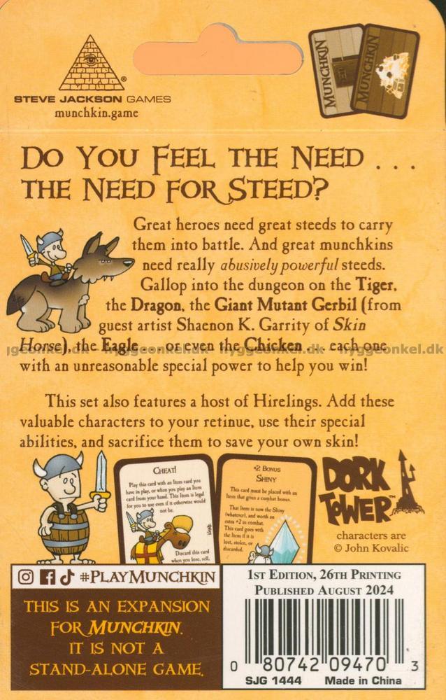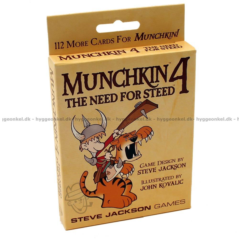 Med The Need for Steed sätter Munchkin sig till häst och fortsätter kampen på en ädel springare. Tigrar, drakar, örnar och till och med en höna kan nu användas när Munchkin gör sin entré i grottsystemet för att börja sparka in dörrar.