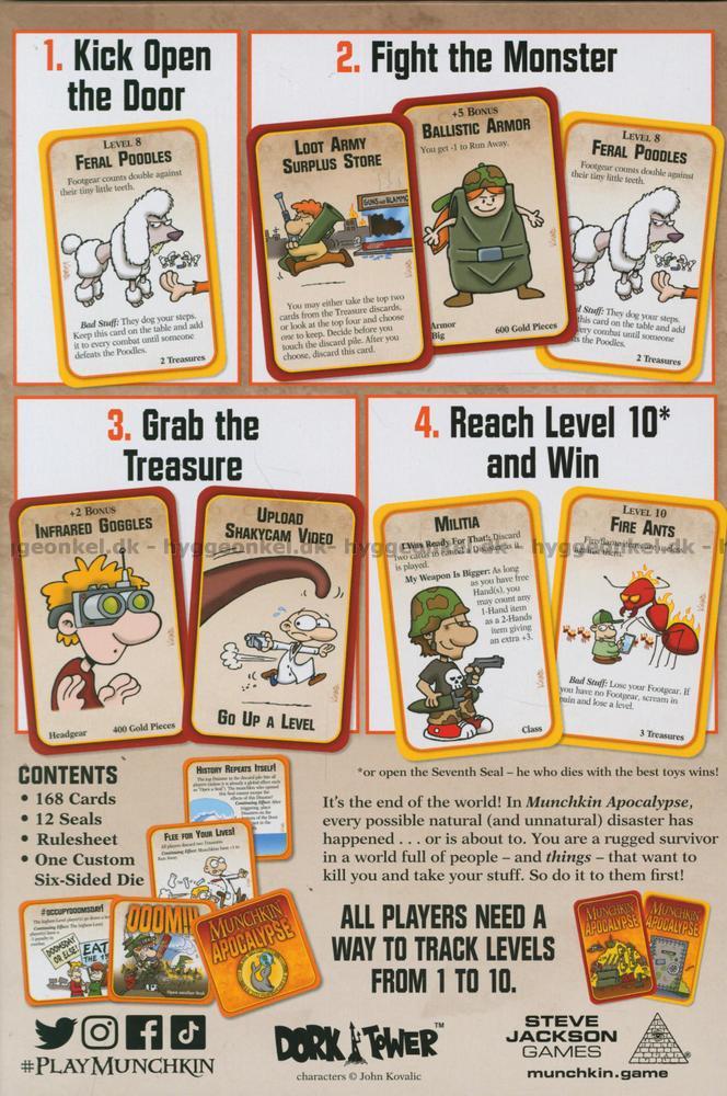 Temat den här gången är världens undergång, och varje Munchkin kommer att få sällskap av zombier, aliens och andra skojigheter. Självklart väntar också atomkrig och tsunamis.