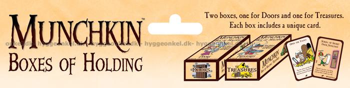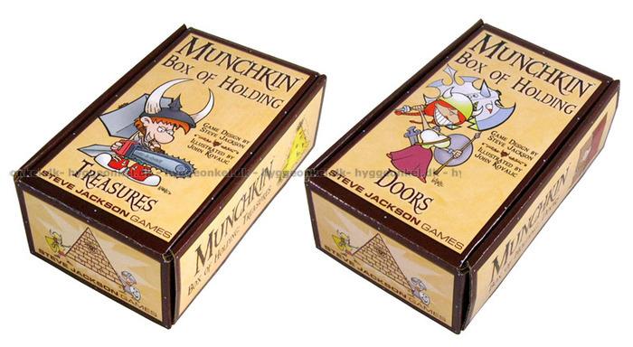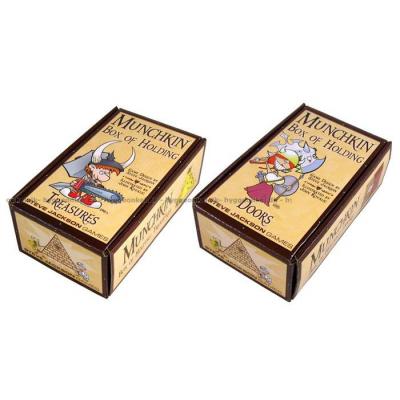 Här får du två askar i kartong att använda för förvaring av dina Munchkin-kort. Den ena asken är märkt "Doors" medan den andra är märkt "Treasures".