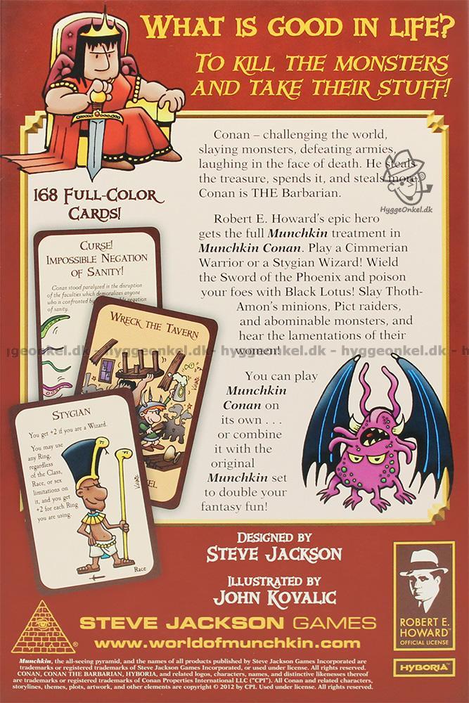 Raserna i Munchkin Conan är "Kushite", "Zamoran", "Cimmerian" och "Stygian". Klasserna är "Cleric", "Thief", "Warrior" och "Wizard".