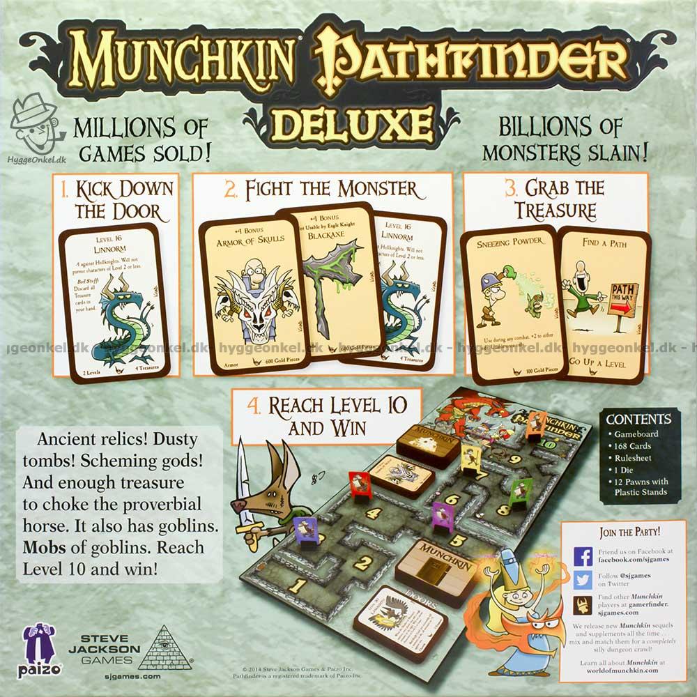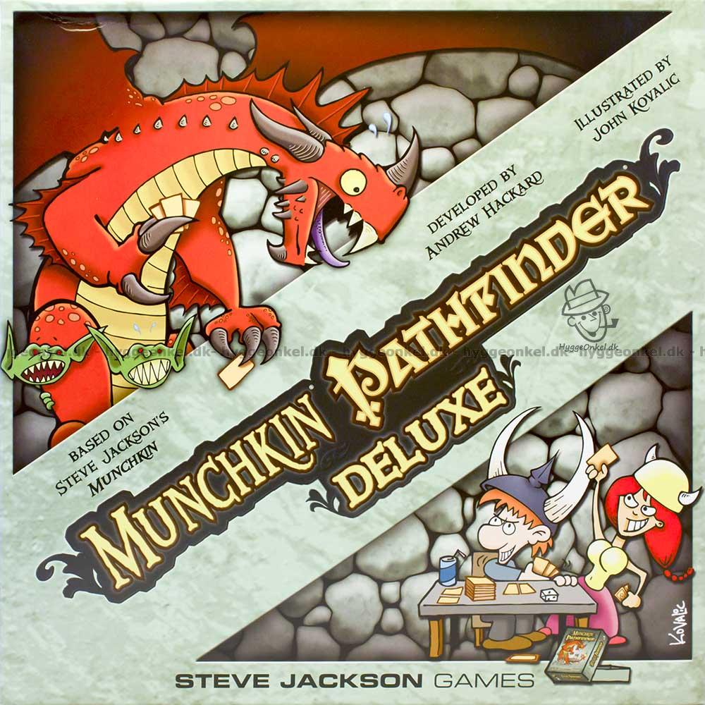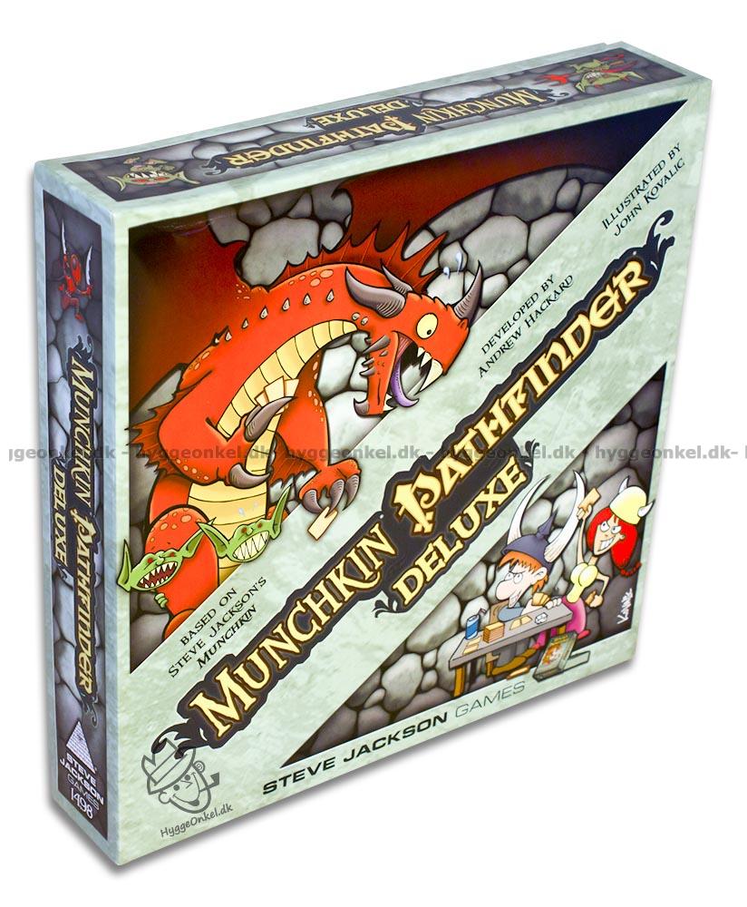Munchkin er lavet i et hav af forskellige udgaver. Her får du Pathfinder-udgaven i en deluxe-version. Hvad der er deluxe over den? Jo ser du: Her er der både spillebræt og 12 brikker med, så du kan holde øje med, hvad level du er i. Ellers er indholdet (kort og terning) det samme som i den almindelige udgave.
