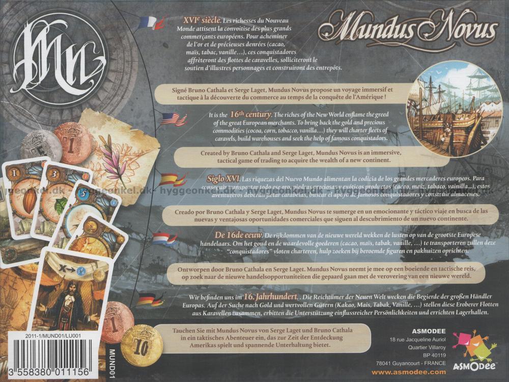 Mundus Novus spelas med två högar med kort: en hög med resurskort som omfattar tio olika slags resurser samt en hög med utvecklingskort som ger ägaren speciella egenskaper. Spelet pågår över ett antal rundor som var och en består av fyra faser.