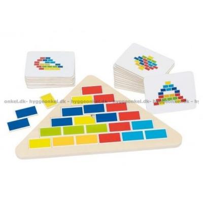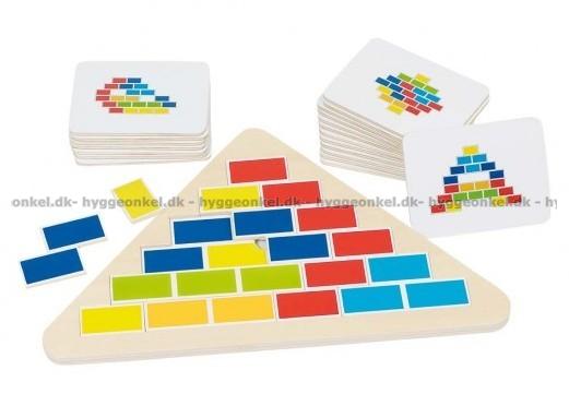Dra ett kort med en utmaning och försök att placera brickorna så att de passar med kortet.