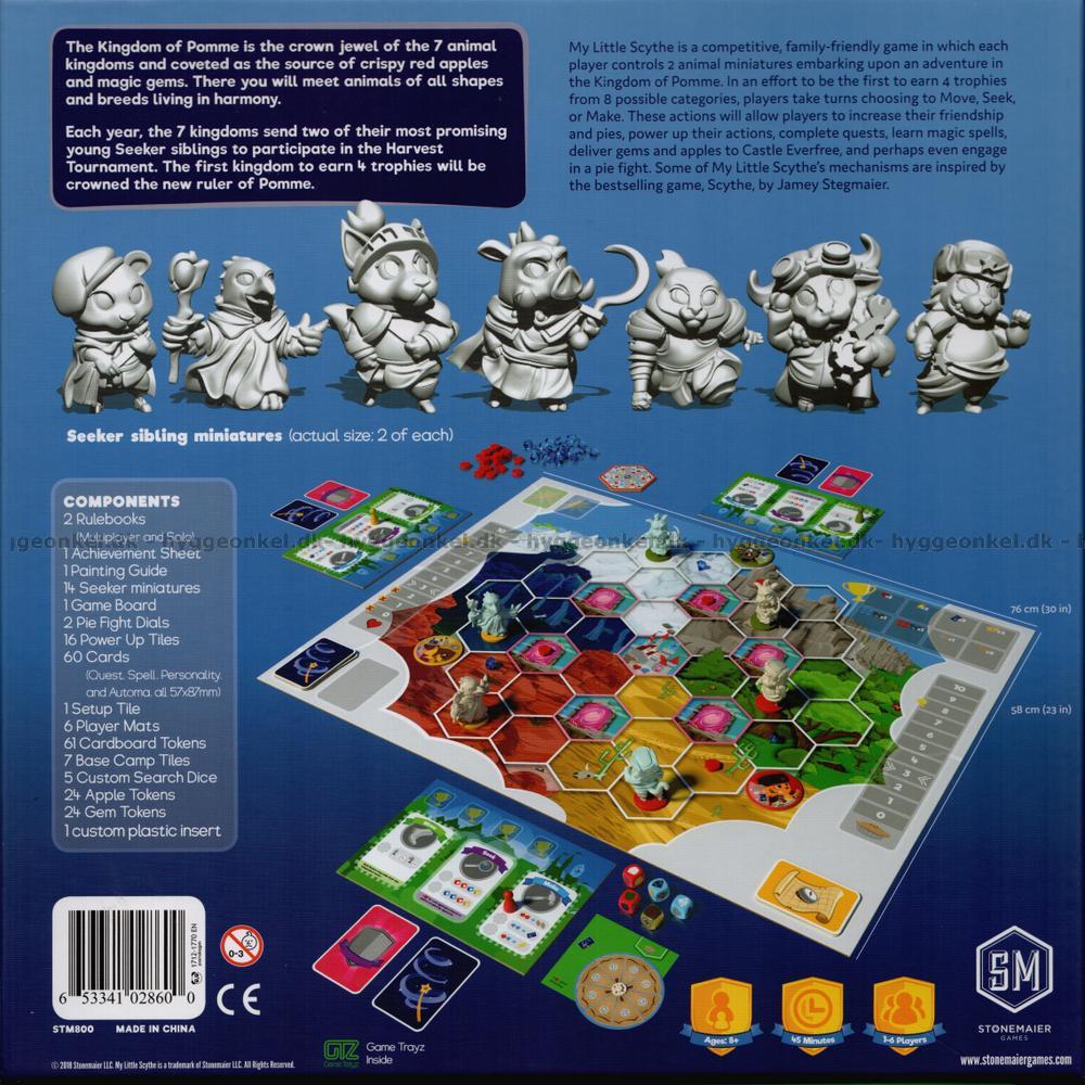 My Little Scythe är ett familjevänligt spel i vilket respektive spelare styr två djurfigurer som drar ut på äventyr i kungariket Pomme.