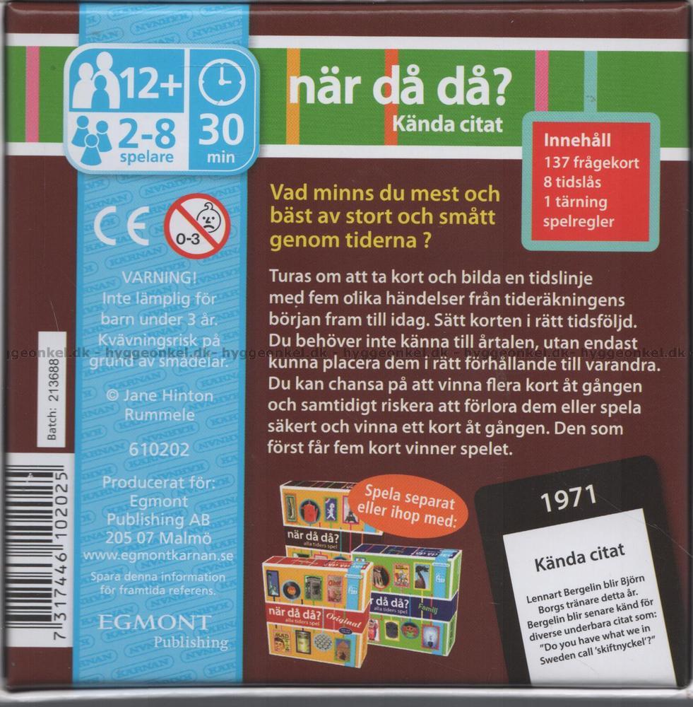 I asken hittar du 137 frågekort, 8 tidslås, tärning och spelregler på svenska.